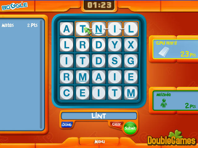 Boggle ist ein spannendes hektisches Wörterspiel mit einer Menge der Wörter, wo man auf drei verschiedene Weise spielen kann! Fördern Sie die Spieler aus der ganzen Welt heraus, kämpfen mit dem Computer oder spielen mit vier anderen Spieler. Sind Sie fertig alles zu verändern? Rütteln Sie die Schachtel und nehmen an diesem Wörterwettbewerb teil!