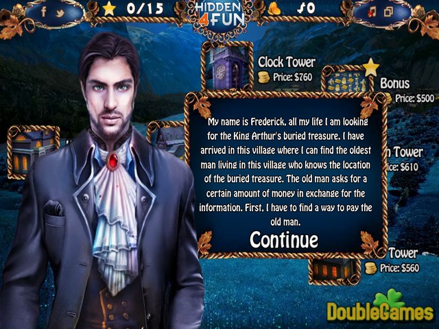 Friedrich ist als ein Mann, der immer alles über die verborgenen Schätze kennt, bekannt. Heute plant er, einige von seinen Geheimnissen zu enthüllen und sie mit euch allen zu teilen. Vergeude nicht diese Chance im neuen und spannenden Wimmelbild-Abenteuer unter dem Titel „Buried Treasure“! Du und Frederic zusammen werden wunderschöne Orte eines kleinen Dorfes erforschen und nach kostbaren Schätzen aus der Zeit von König Arthur suchen! Folge der Karte und finde alle Schätze. Viel Glück im Spiel „Buried Treasure” auf unserer Webseite online und absolut kostenlos!