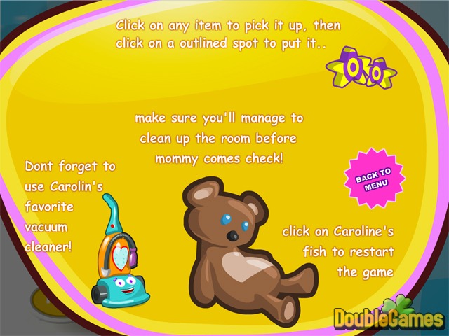 Entdecken Sie das neue ganz tolle und lustige Wimmelbild-Spiel „Caroline's Ordering Room is Fun“! Hier haben Sie einem netten Mädchen Caroline helfen, das Zimmer aufzuräumen, bevor ihre Mutter nach Hause zurückkehrt! Die Regeln des Spiels sind einfach. Klicken Sie bloß auf einen Gegenstand, um ihn zu heben und dann klicken Sie auf einen passenden Umriss, um den Gegenstand auf seinen Platz zurückzulegen. Nutzen Sie auch den Staubsauger am Ende. Achten Sie auf die Zeit und beeilen sich. Spielen Sie „Caroline's Ordering Room is Fun“ schon jetzt und absolut gratis.