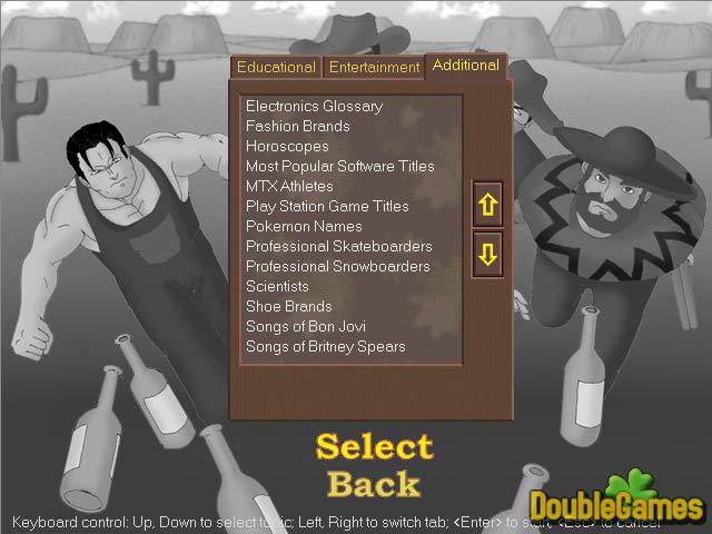 Ein frischer westlicher Blick auf das beliebte Henkerspiel mit coolen Features, die nicht in gewöhnlichen Henkerspielen gibt. Kämpfen Sie mit verschiedenen Gaunern um Goldmünzen, benutzen Sie Dynamit, Glückshufeisen und Mäuse als Ihre Waffen! 3 Spielmoden stehen Ihnen zur Verfügung: Billy's Adventure, General- and Topicmoden, jeder mit eigenem Spielstil. Das hat mehrere Wortthemen, aber Sie können auch eigene erschaffen!