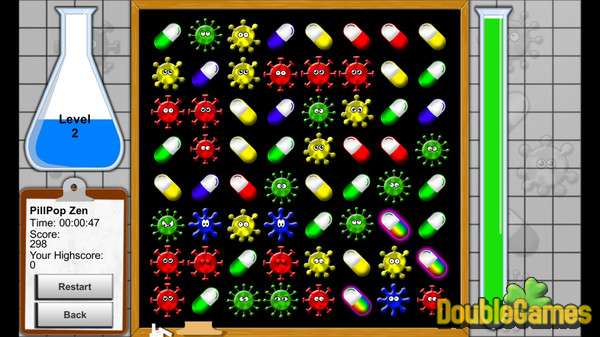Löschen Sie die Viren, indem Sie auf die Pillen klicken, um sie zu zerstören. Entspricht Dreiergruppen hintereinander, die mindestens eine Pille der gleichen Farbe enthalten. Das Spiel enthält auch die normalen Pop-Spiel-Modi namens VirusPop, wo Sie nur Viren der gleichen Farbe zusammen passen müssen. Es gibt einen Zen-Modus, für den entspannten Spielstil und keine Zeitliche Einschränkungen. diesen Modus für ein entspannendes Spielerlebnis. Blitz-Modus ist für ein schnelles Spiel von nur 2 Minuten, wo Sie versuchen müssen, so viele Punkte wie möglich zu erzielen. Und schließlich der Survival-Modus, beginnt mit einem teilweise gefüllten Level. Das Level beginnt sich langsam zu füllen, und das Spiel endet, wenn das Level voll ist. Jeder Modus kann auf 6 verschiedenen Ebenen mit unterschiedlichen Größen und Mengen an Virusfarben gespielt werden.