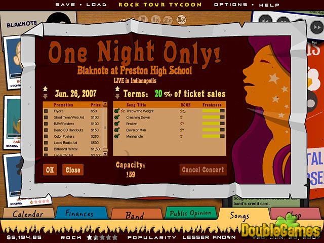 Rock Tour Strategiespiel bietet dir an, als ein Rock-Band Managemer zu arbeiten. Teste deine Leitfähigkeiten in diesem Spiel und du wirst sofort verstehen, was sich hinter der Bühne versteckt - Hinter der Bühne steht immer der Band-Manager, der die Show organisiert, für die Band Reklame macht und natürlich für den Geldfluß sorgt. Starte mit einer kleineren Rock-Band, wähle die Strategie und schenk dieser Band riesige Popularität! Hab viel Spaß beim Spielen!